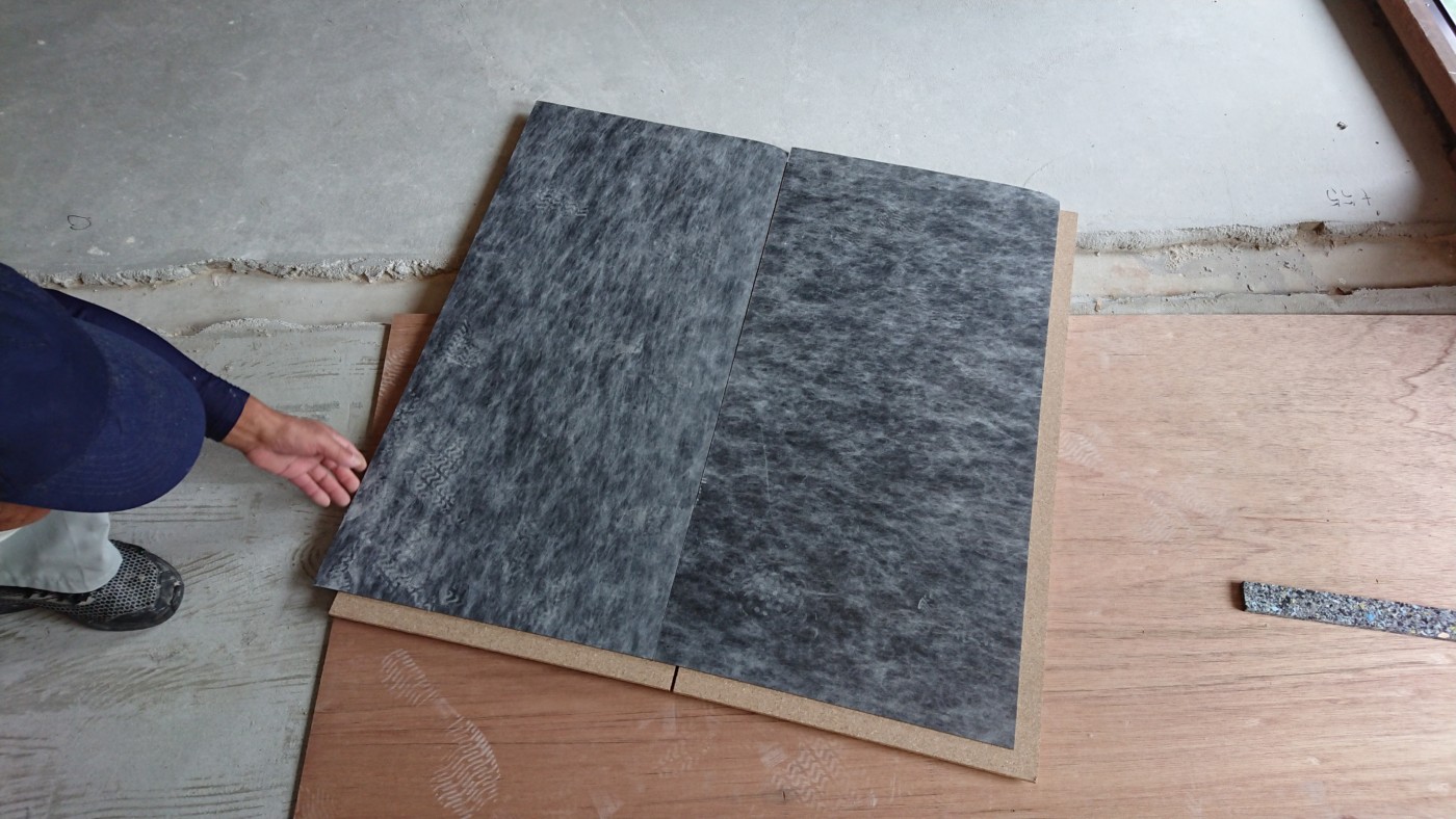 - 無垢の床材に一体型として、遮音材が接着された商品を採用する。
